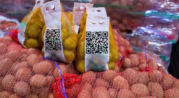 Packed potatoes with a bar code. The first step to traceability is labeling. While most farms are not required to label each piece of produce they sell, processors prefer…