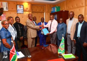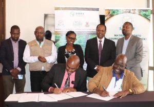 NPCK CEO, Mr. Wachira Kaguongo, and Nyandarua Deputy Governor John Mathara Mwangi pose for a photo after the signing of the MoU; present: AGRA, KALRO-Tigoni, Egerton University, NAVCDP, Yara Kenya, Tower Sacco.