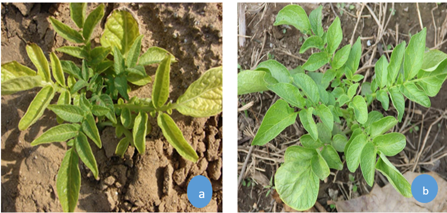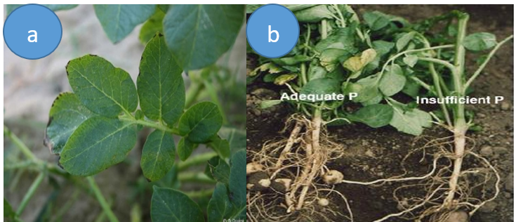 Fig 3. (a) Purple colouration of the leaf edges (b)Poor root development and reduced number of tubers in in P deficient crop (Photo:Yara)