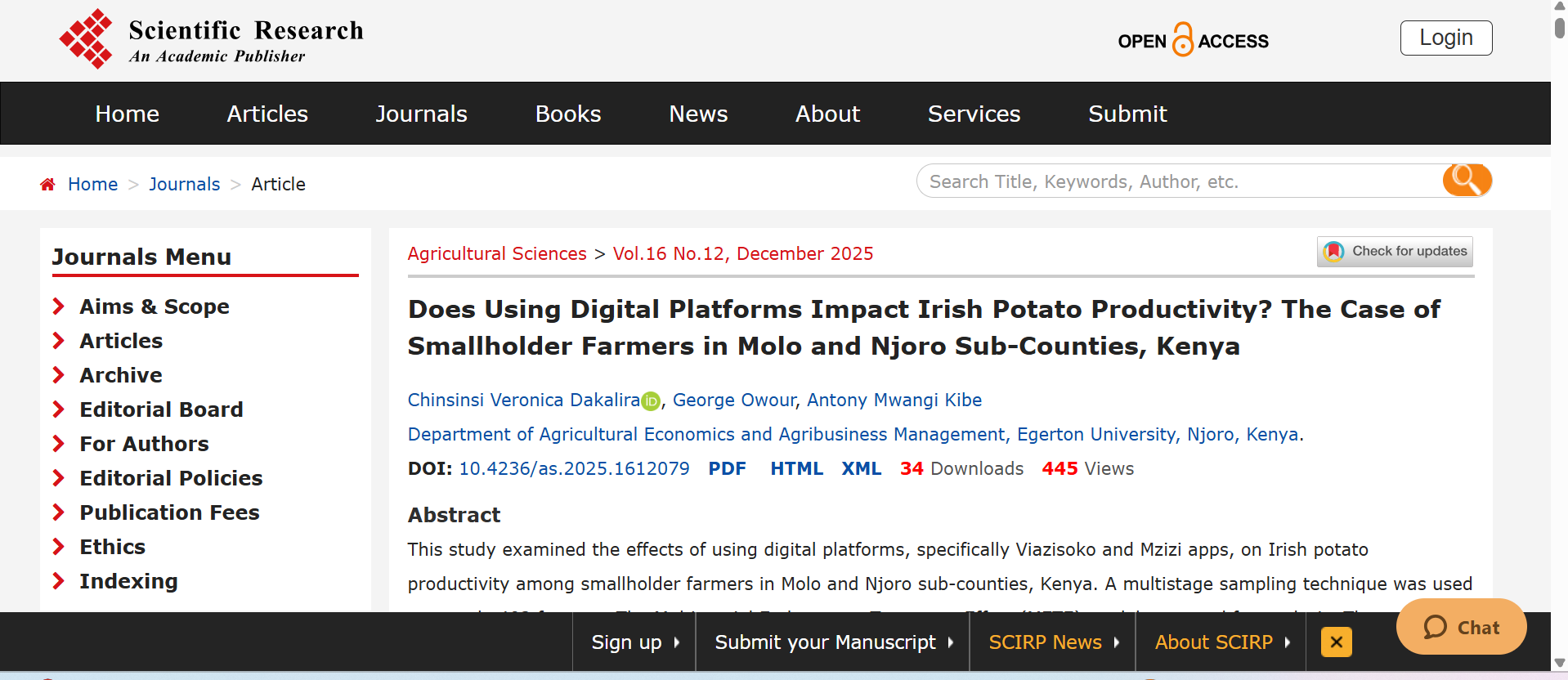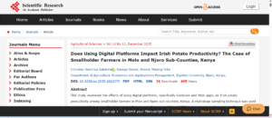Recent research published in Agricultural Sciences: “Does Using Digital Platforms Impact Irish Potato Productivity? The Case of Smallholder Farmers in Molo and Njoro Sub-Counties, Kenya,”  demonstrates that farmers who were aware of digital platforms or actively used them recorded significantly higher productivity compared to those who were unaware. Notably, even awareness alone was associated with improved outcomes, suggesting that knowledge shared through farmer networks and extension services can benefit the broader farming community.